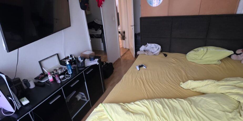 Das ruhige Schlafzimmer bietet genügend Platz für ein Doppelbett und zusätzliche Möbel. Die Wohnung eignet sich ideal für Singles oder Paare, die eine helle und praktische Wohnung mit angenehmer Wohnqualität suchen.