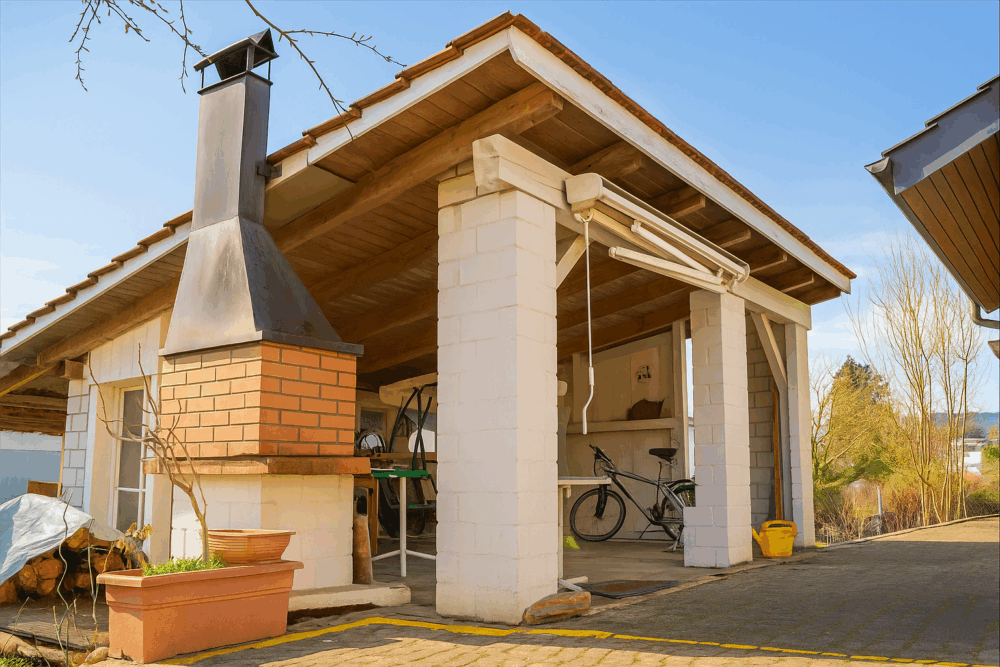 + GARTEN: überdachter Sitzplatz mit Grillstelle, grosse Wiese, Velo-Unterstand