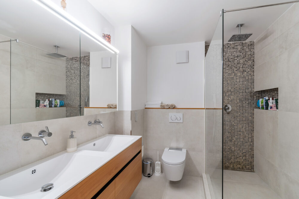 + BAUQUALITÄT: massive Bauweise, marmorierte Fliesen, Wärmepumpe, Fotovoltaik, Glasfaseranschluss