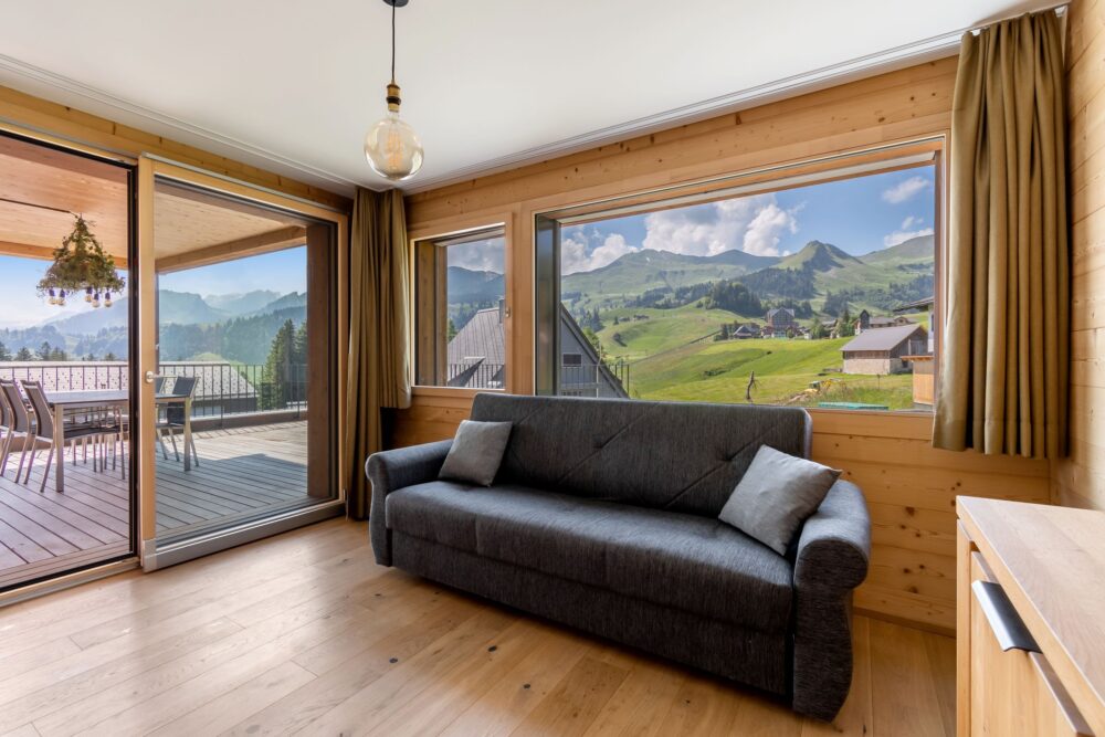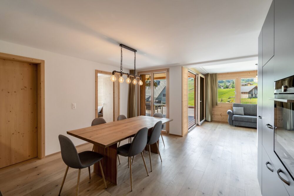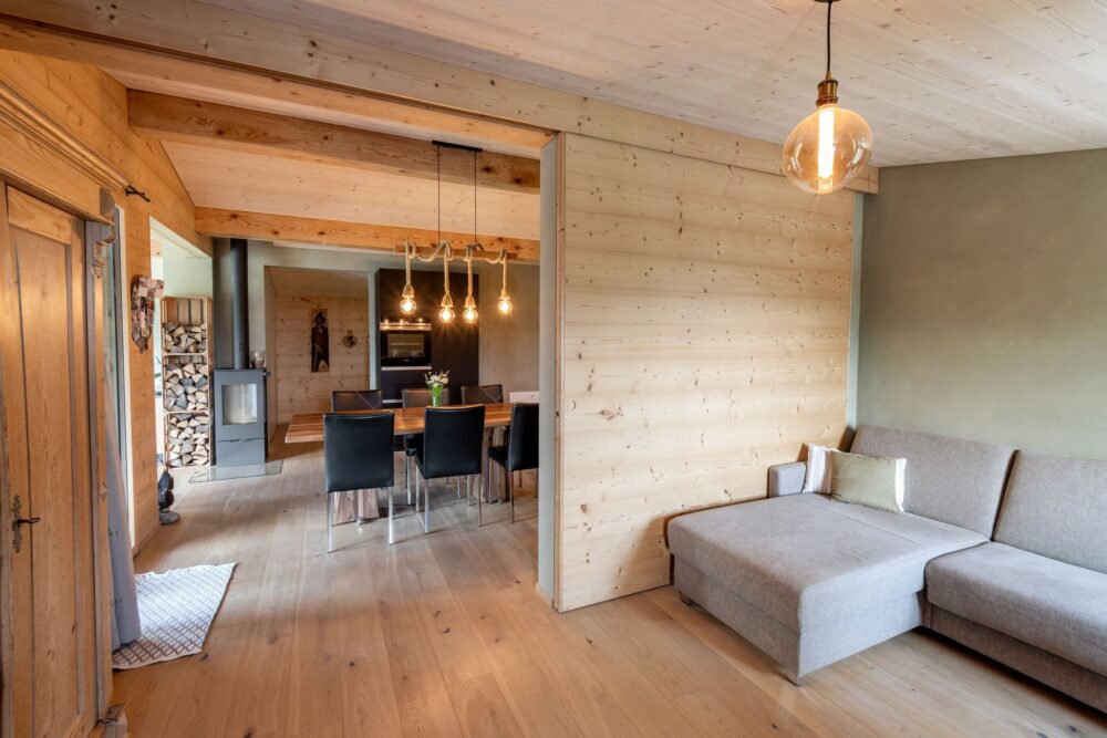Die Wände wurden mit einem edlen Tannenholz eingekleidet, der qualitative Parket strömt eine angenehme Wärme, der offene Grundriss welche den modernen, offenen Akzent hineinbringt, sind eine wahre Harmonie. Beim Innendesign wurde geachtet, dass sich die Materialien perfekt in die Umgebung einpassen. Wenn Sie dank den grossen, filigranen Fensterfronten nach aussen schauen, ist der Einklang von Innen nach Aussen eine hocherhabene Sinfonie. Verzichten müssen Sie hier auf nichts, grosse Nassbereiche für Sie und Ihre Gäste, Living offen perfekt angrenzend an die sehr moderne Küche mit allen Extras, helle Zimmer und alle mit einer einmaligen Weitsicht, ob auf die Berge, die Weite oder den Wald.
