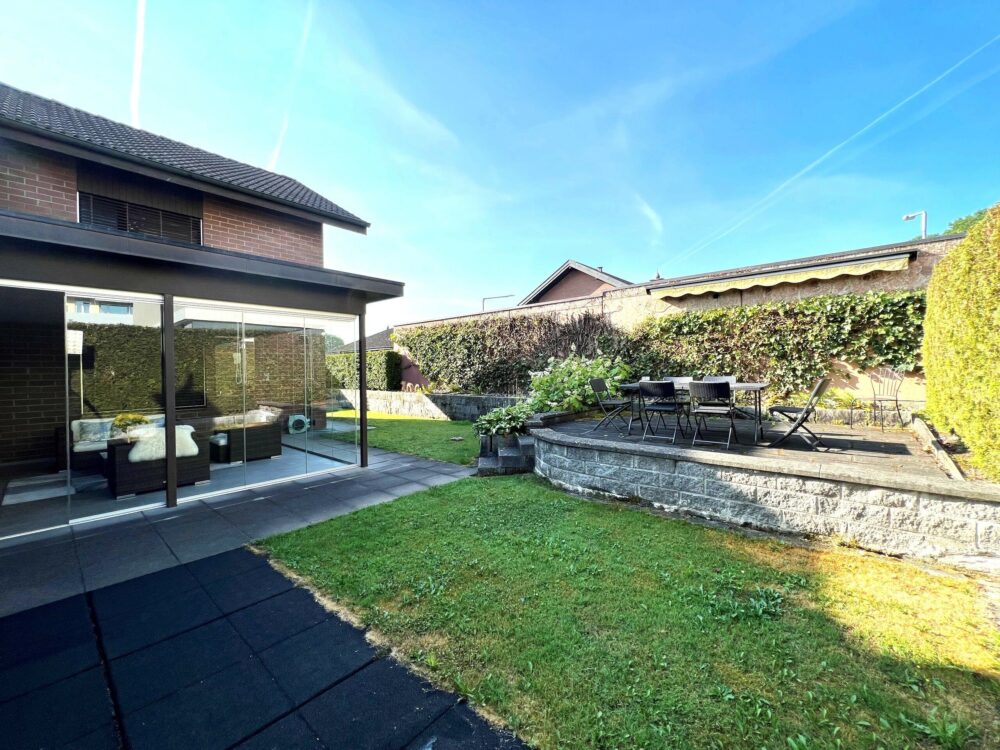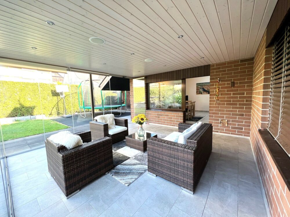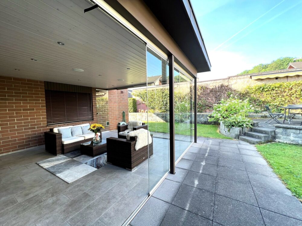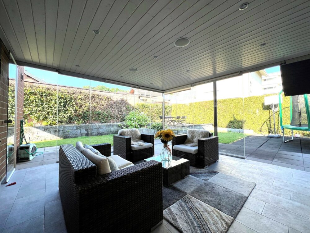 Vom Living-Bereich erreichen Sie den Wintergarten mit einer sehr hochwertigen, pflegeleichten Verglasung. Hier werden Sie bei jedem Wetter die Sonne geniessen und den Vögeln zuhören.