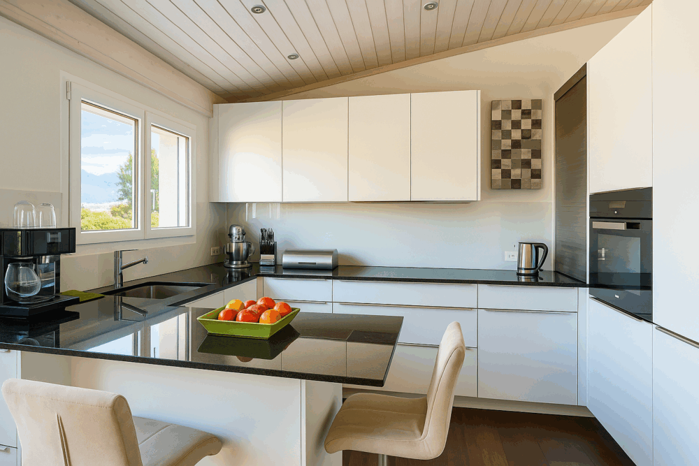 Die hochwertige Küche ist ein Traum für alle, die gerne kochen: Miele-Geräte, darunter ein Kombi-Dampfbackofen, ein Glaskeramikkochfeld und eine grosszügige Geschirrspülmaschine, sorgen für höchsten Komfort. Ergänzt wird das Angebot durch einen Waschturm von V-Zug (Waschmaschine und Tumbler) im separaten Waschraum.