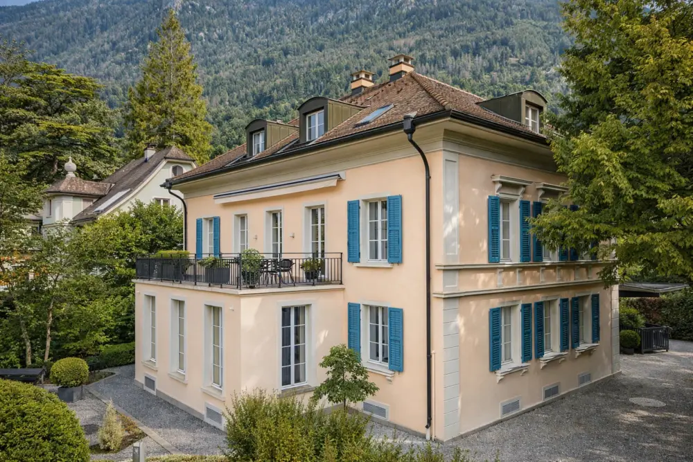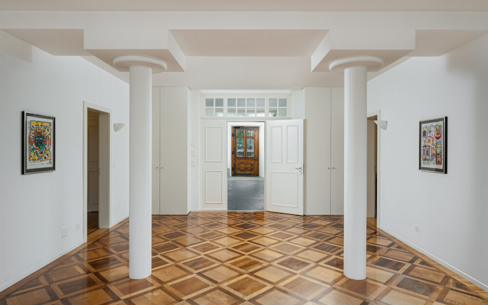 Massive Aussenwände, holzverkleidete Wandfelder an den hohen Wänden in Kassettenbauweise mit subtilen Zierfräsungen sowie hochwertige Parkettböden lassen jeden Raum seinen eigenen Charakter ausleben, in harmonischer Folge, grosszügig und dennoch klar zoniert. Die ornamentalen Stuckeinlagen an den Decken, grosszügigen Fensterfronten und die massiven, hohen Eichen-Türen in unvergleichlicher Eleganz sind nur ein kleiner Teil dieser Imposanz, die subtil Stil und Raffinesse vermittelt und ein Gefühl zeitloser Würde sowie historischer Tiefe erzeugt. Eine einzigartige Villa, die vielfach kopiert wurde, deren unverwechselbare Authentizität jedoch für immer dem Original vorbehalten bleibt.