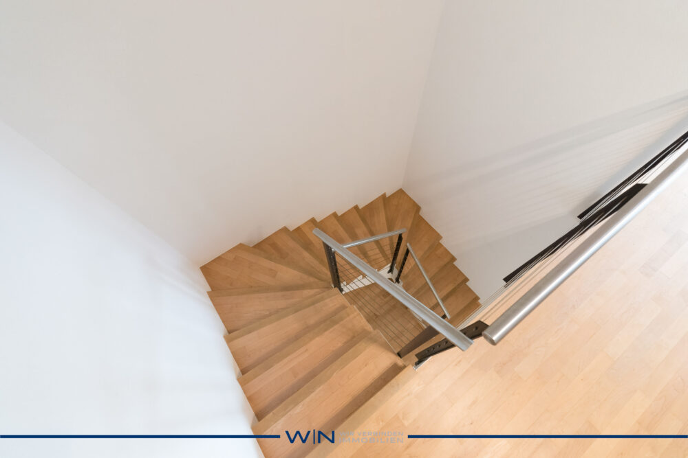 Über eine elegante Treppe gelangen Sie ins darunterliegende Geschoss, wo sich zwei grosszügige Schlafzimmer und das stilvolle Badezimmer befinden. Die klare Trennung zwischen Wohn- und Schlafbereich sorgt für höchsten Wohnkomfort und Privatsphäre.