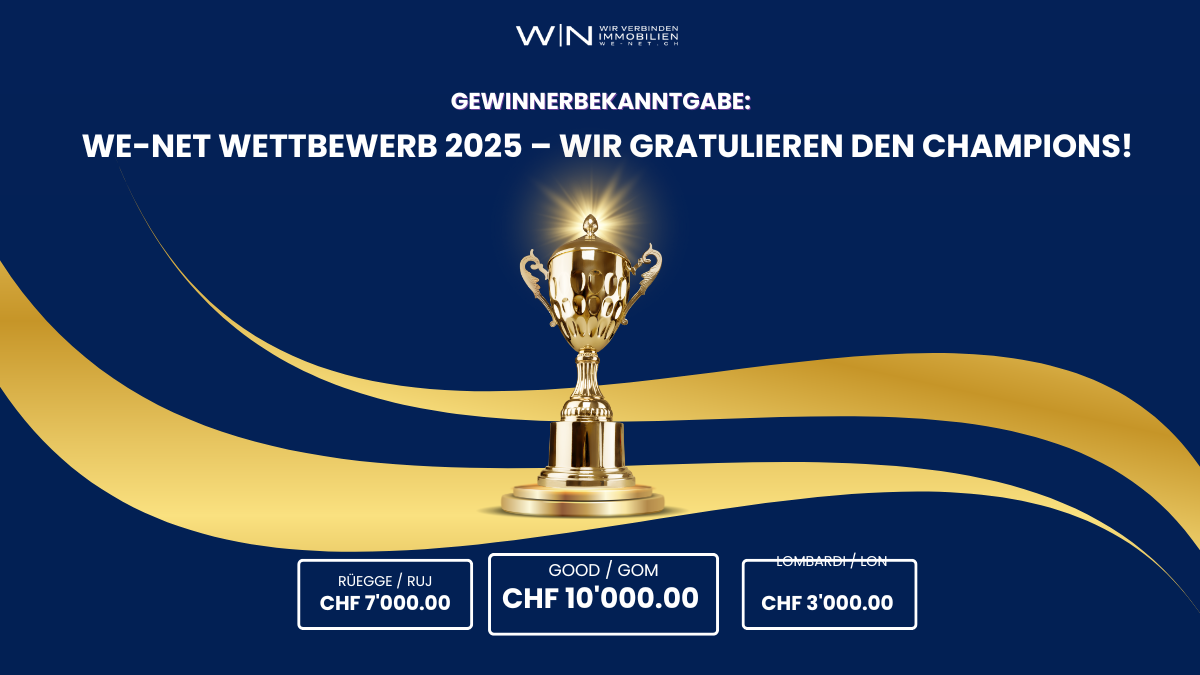 Auch Frau Lombardi überzeugte mit 56 Besichtigungen und verdiente sich damit den dritten Platz sowie ein Preisgeld von CHF 3’000.–. Ihre Leistung unterstreicht, dass bei WE-NET Qualität und Durchhaltevermögen honoriert werden.